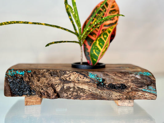 Handmade Banyan Wood Ikebana (Japanese Style Vase) with Bark Inclusion and Turquoise and Anthracite Inlay, Wood Ikebana, Made in Hawaii