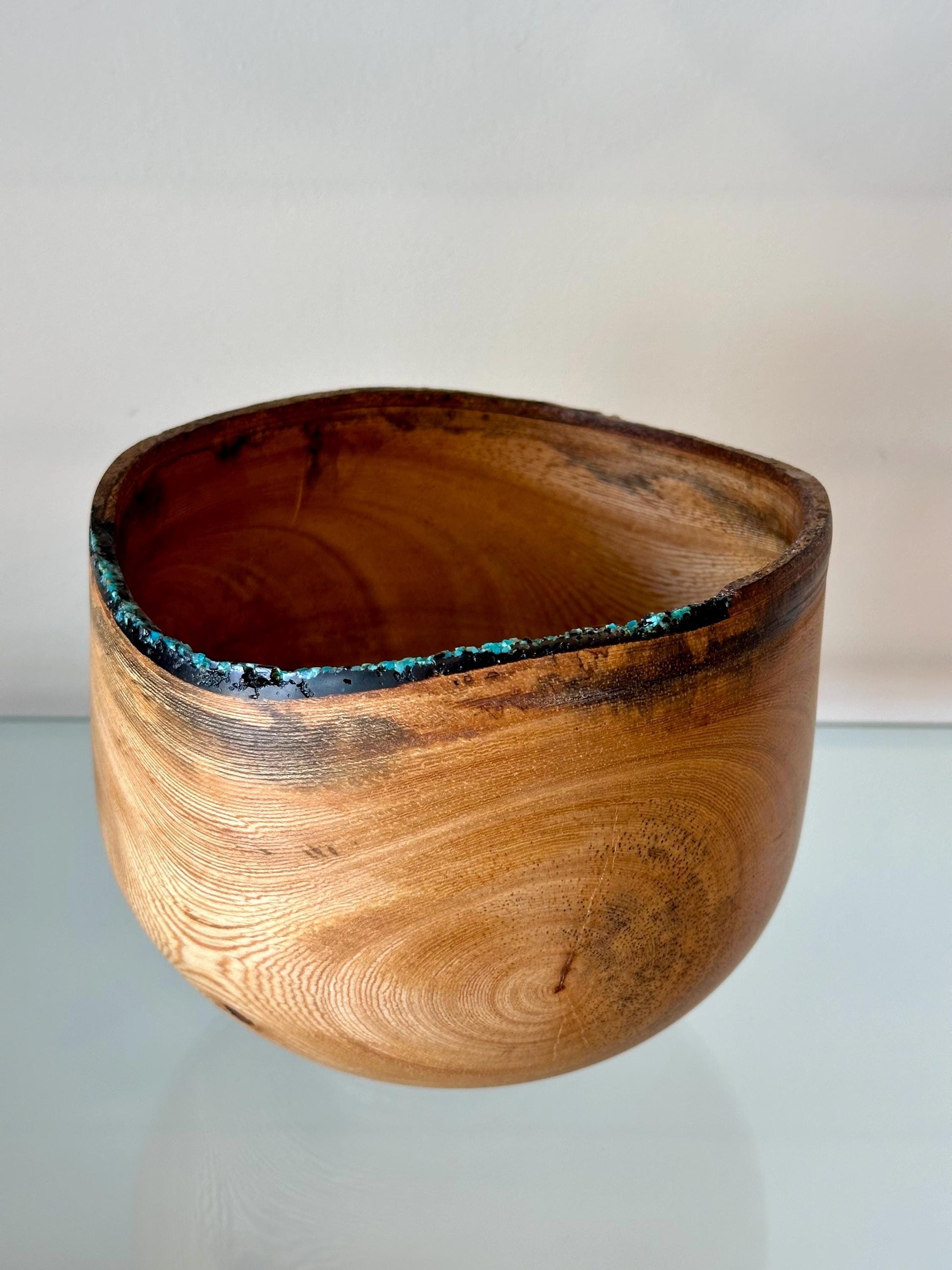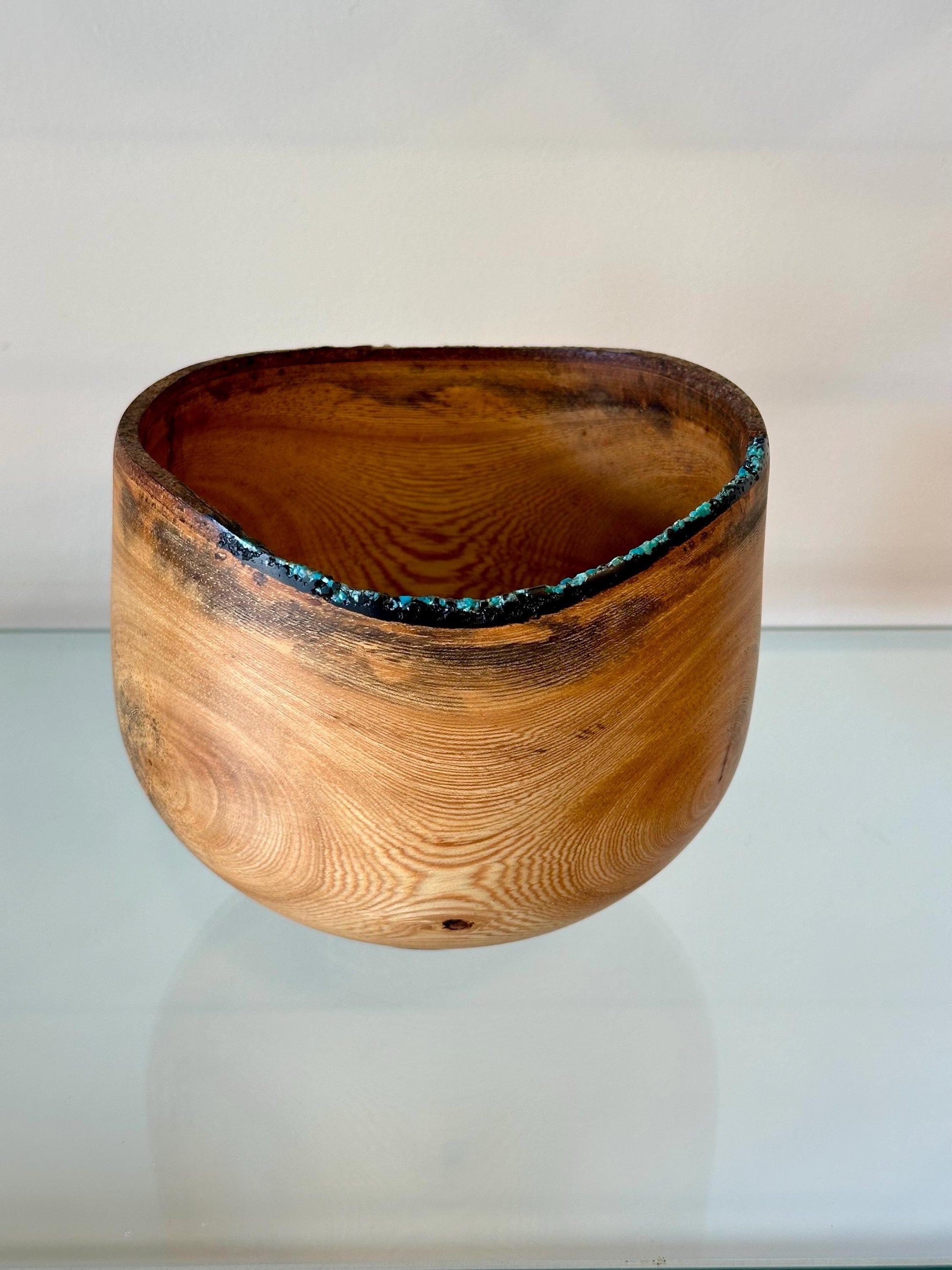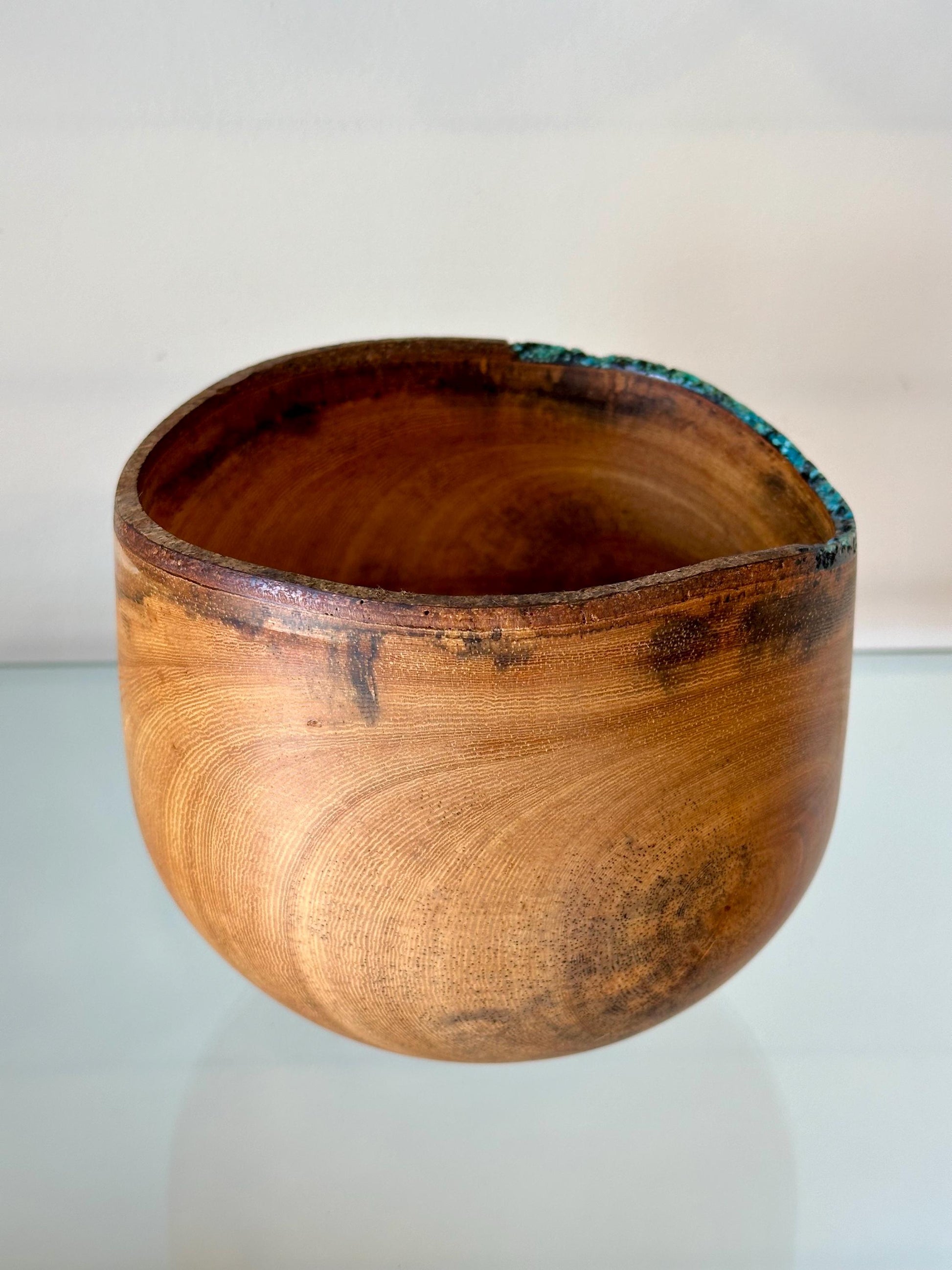 Banyan wood bowl, Decorated with turquoise gemstone and Alaskan Anthracite inlay, Handmade in Hawaii by Llosh Winne