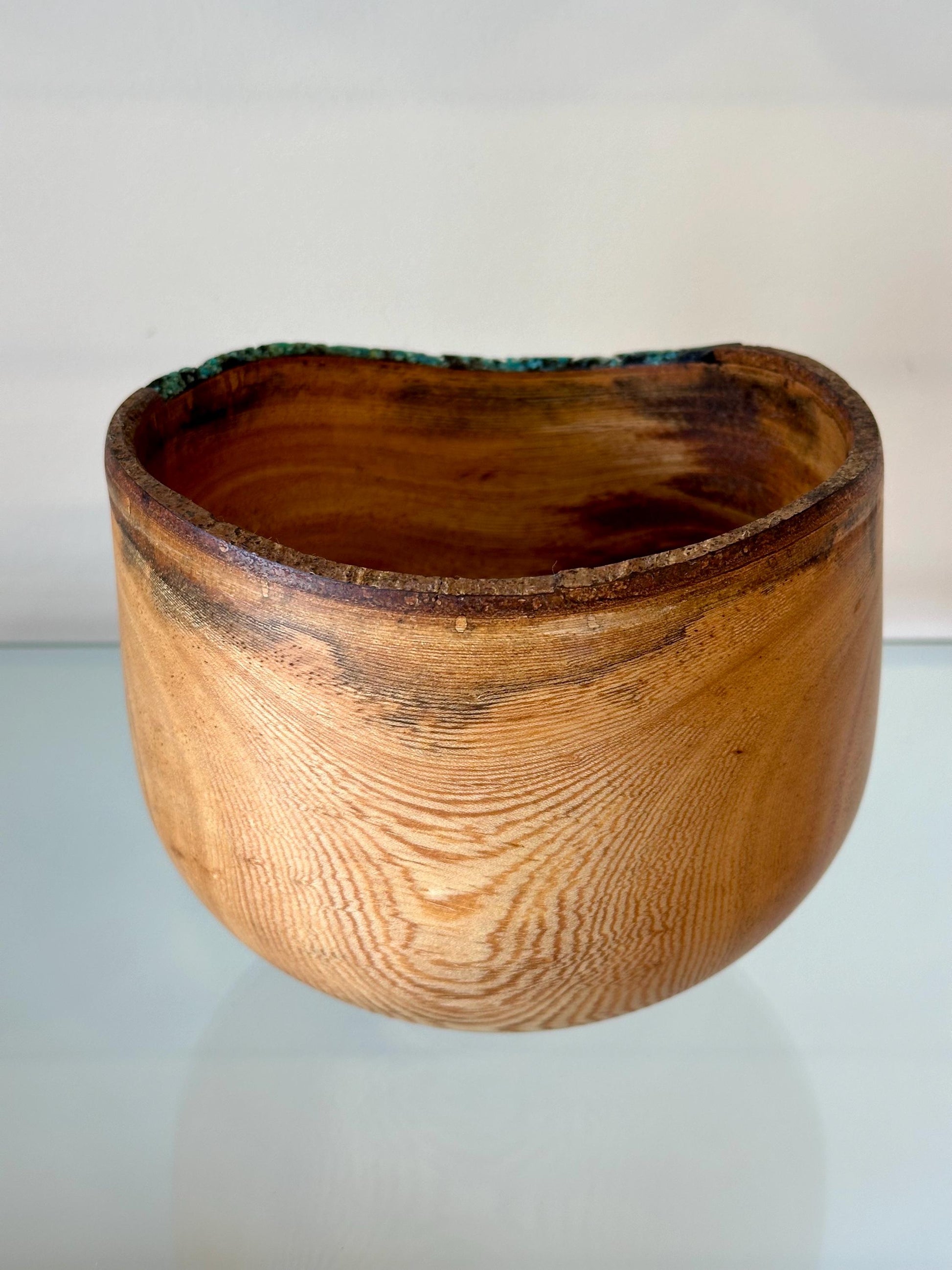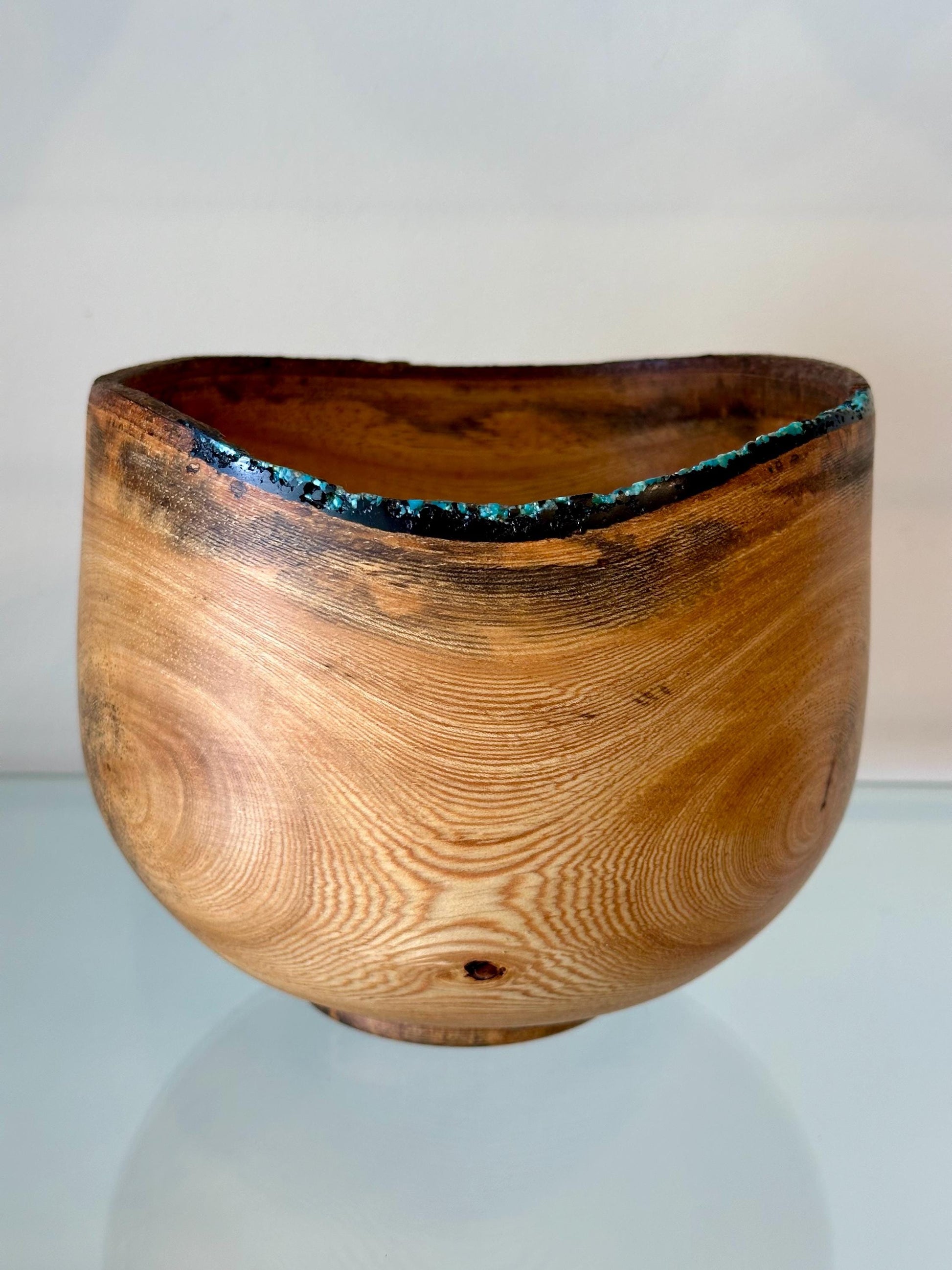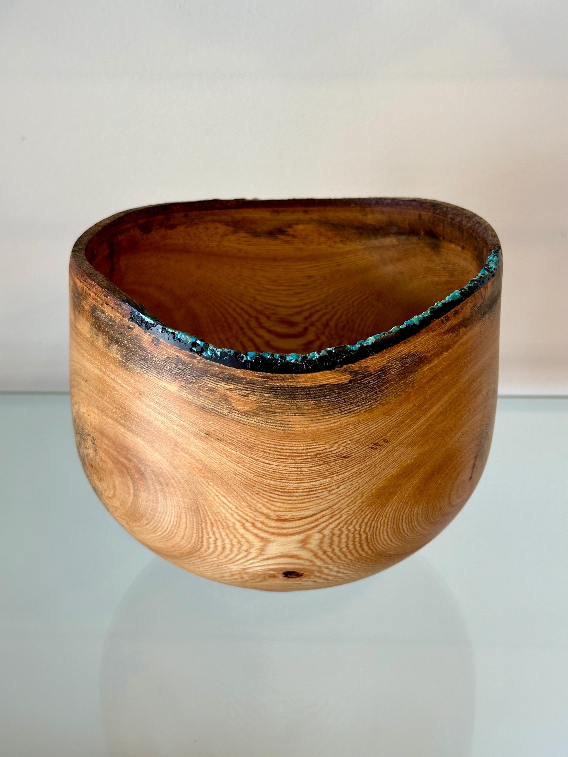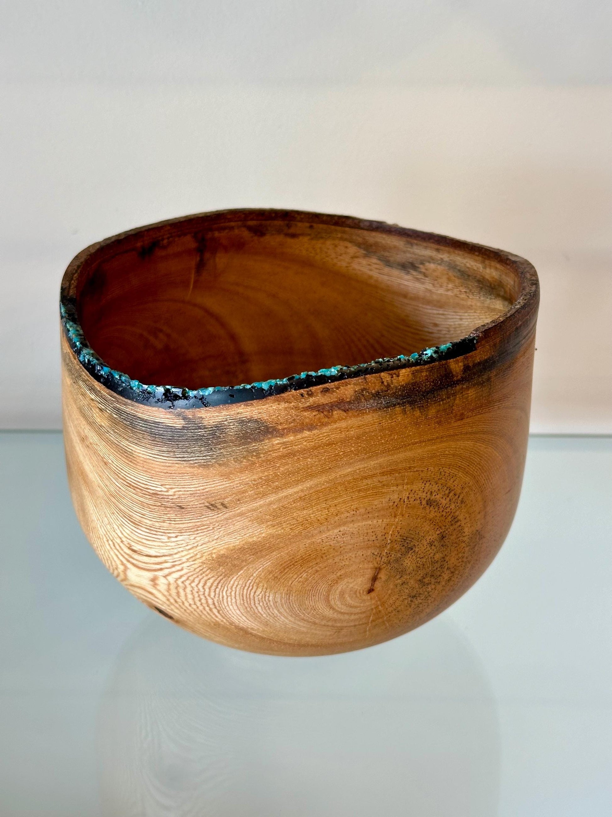 Banyan wood bowl, Decorated with turquoise gemstone and Alaskan Anthracite inlay, Handmade in Hawaii by Llosh Winne