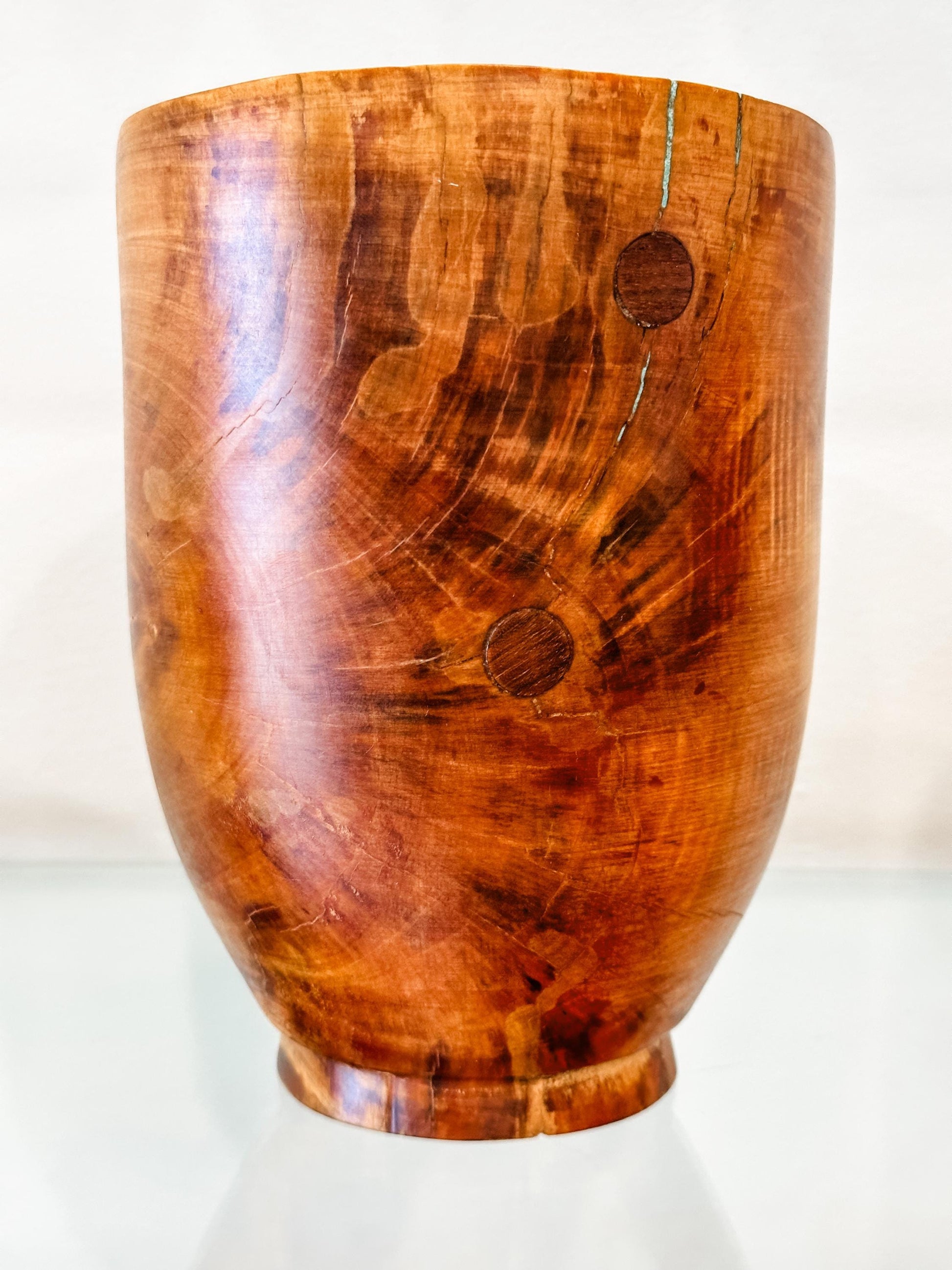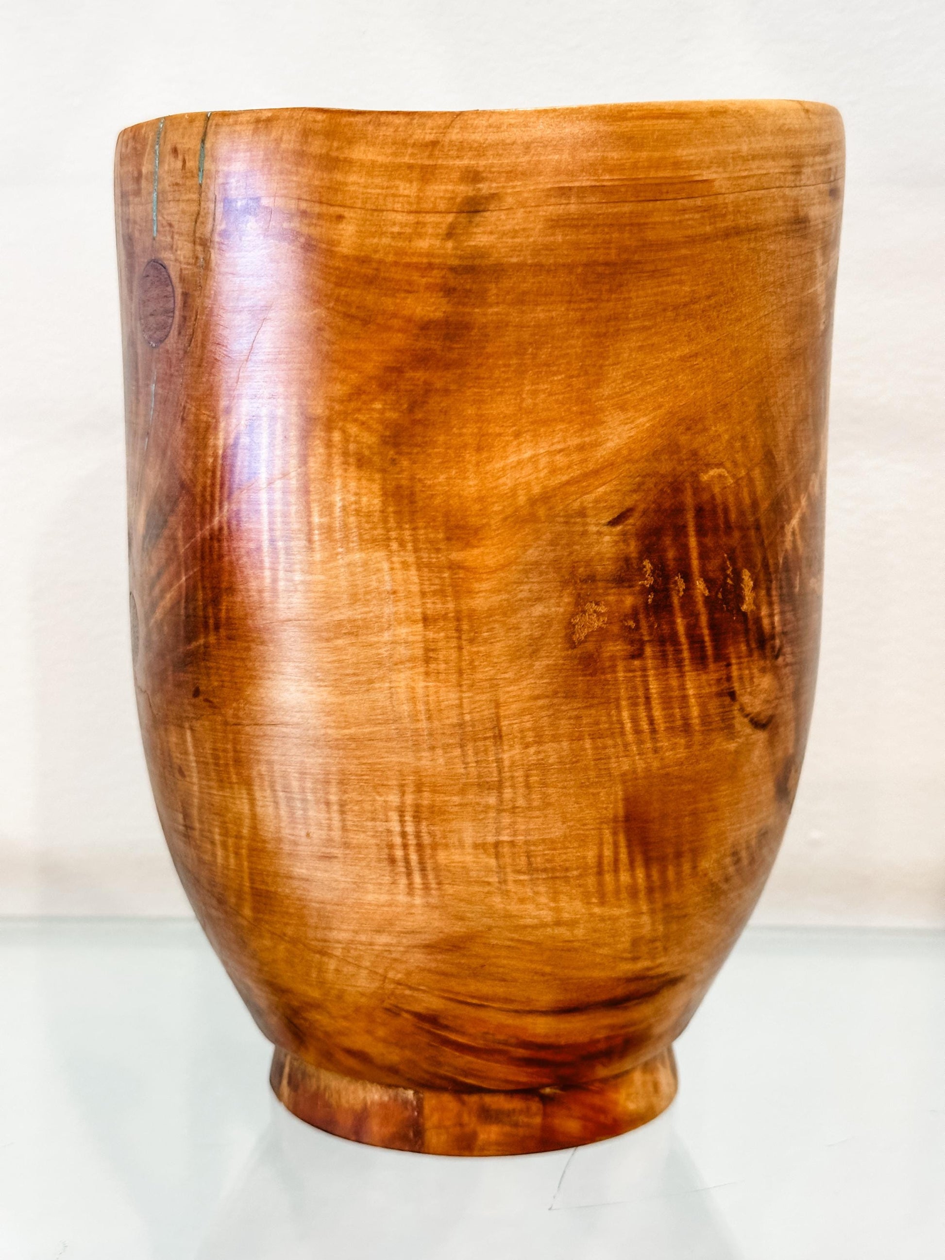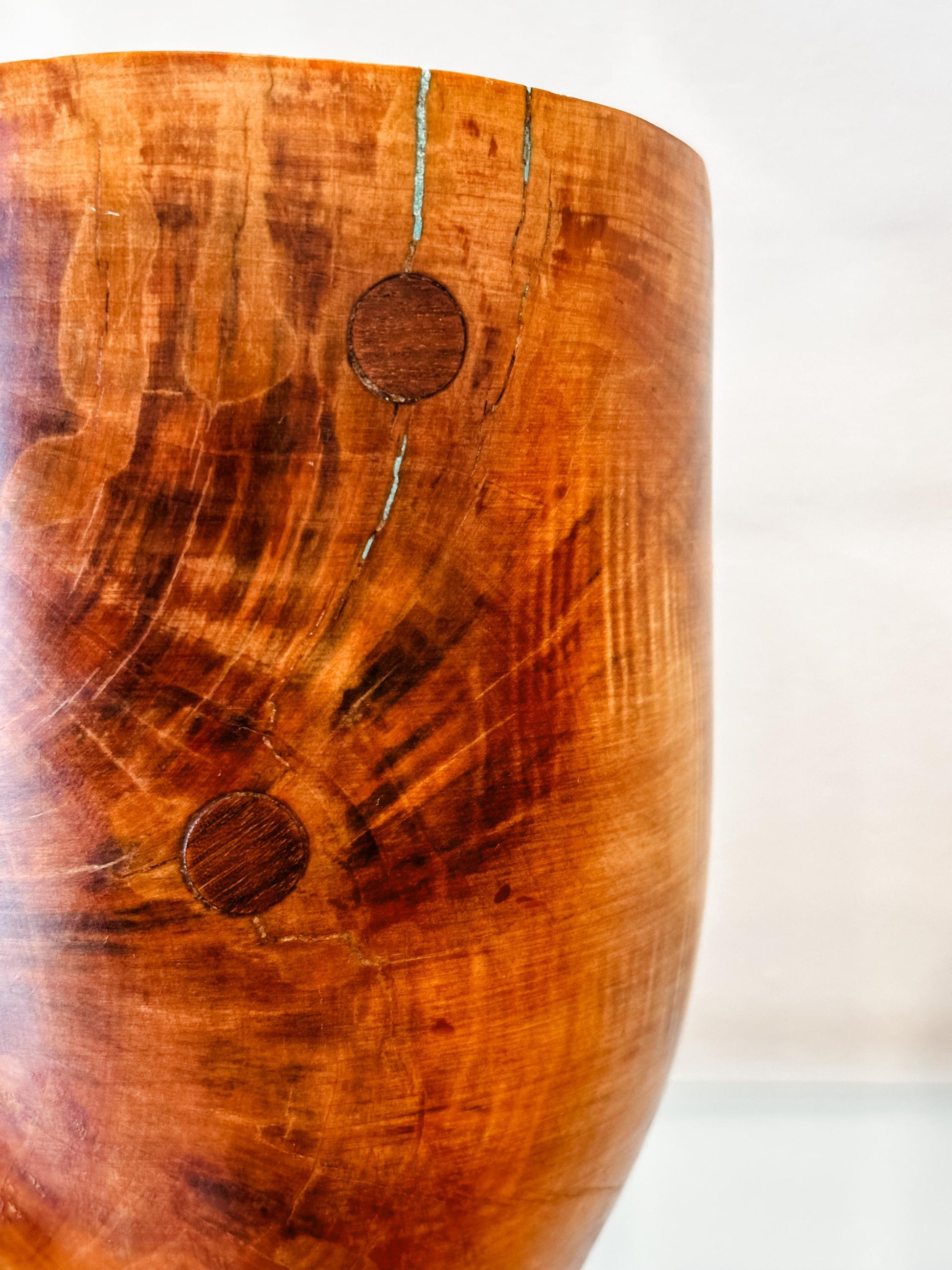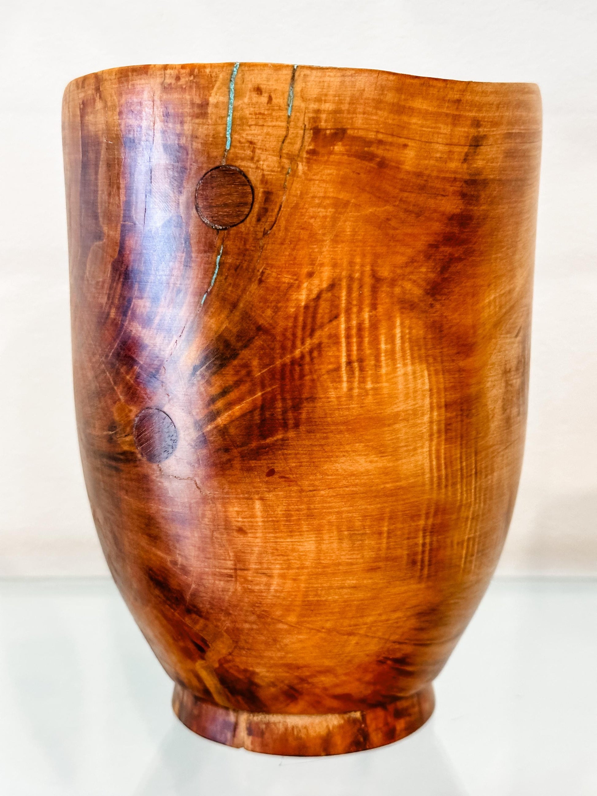 This beautiful orange wood bowl was hand-turned and hand-polished from an orange tree on the Big Island of Hawaii by professional bowl turner Llosh Winne. With real turquoise detailing and stunning lines and colors organically formed in the wood, this bowl is a true work of art, perfect for a wedding gift or home décor item. This vase-shaped bowl is repaired and beautified in Japanese kintsugi-inspired style. The artist fills holes and cracks in the wood with colorful turquoise gemstones. More than an art form, kintsugi is a metaphor for healing, reminding us that what is broken can be fixed. Instead of discarding something that breaks, we can repair it and the repair adds beauty and value, just like our challenges and traumas can strengthen us as humans. As a philosophy, Japanese kintsugi treats breakage and repair as an honorable and beautiful part of the history of an object that enhances, rather than diminishes, the value. Kintsugi teaches us that the “flaws” in wood art are what make each piece unique and valuable. We use the highest quality, organic finishing products, making our bowls food safe and chemical-free. Can be engraved. 5 inches diameter x 7 inches tall