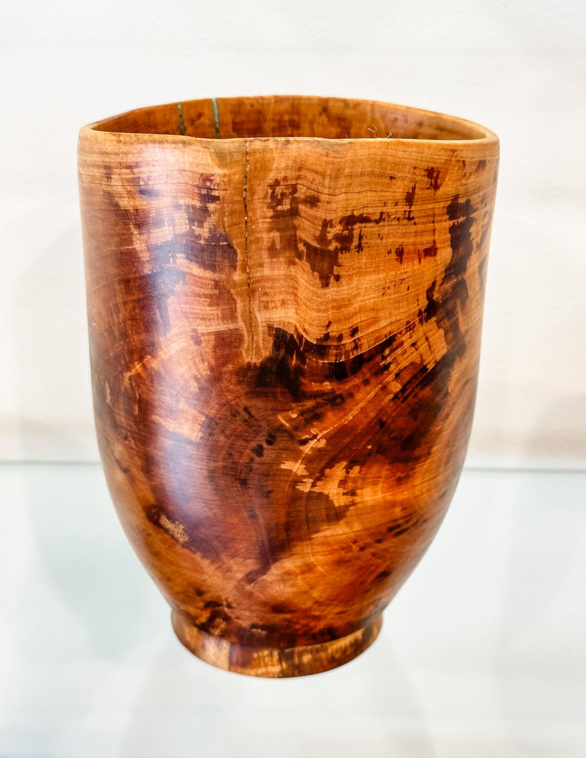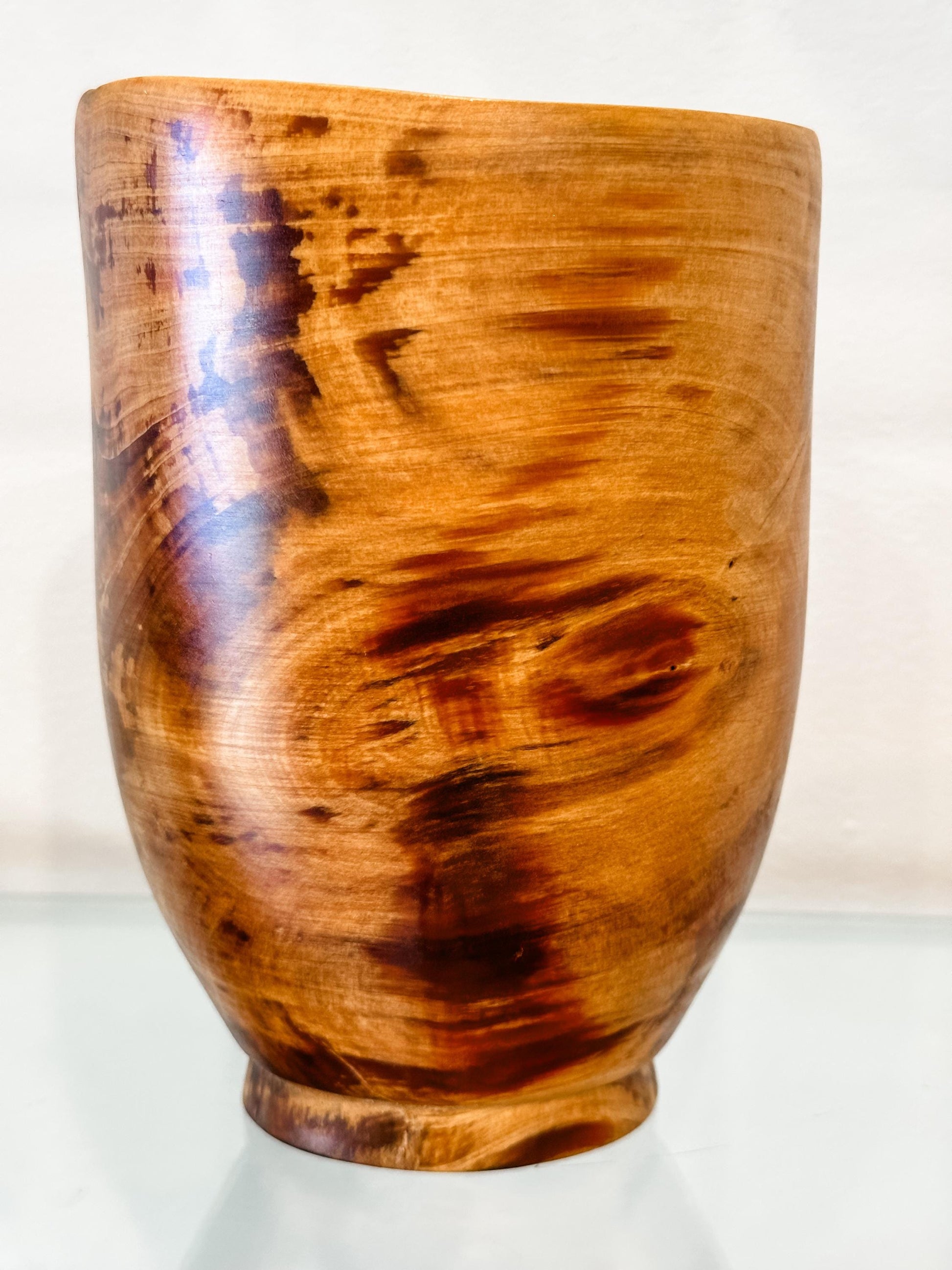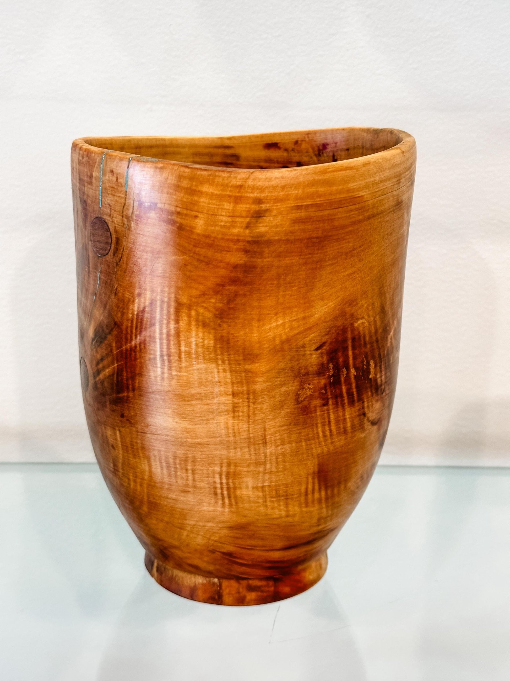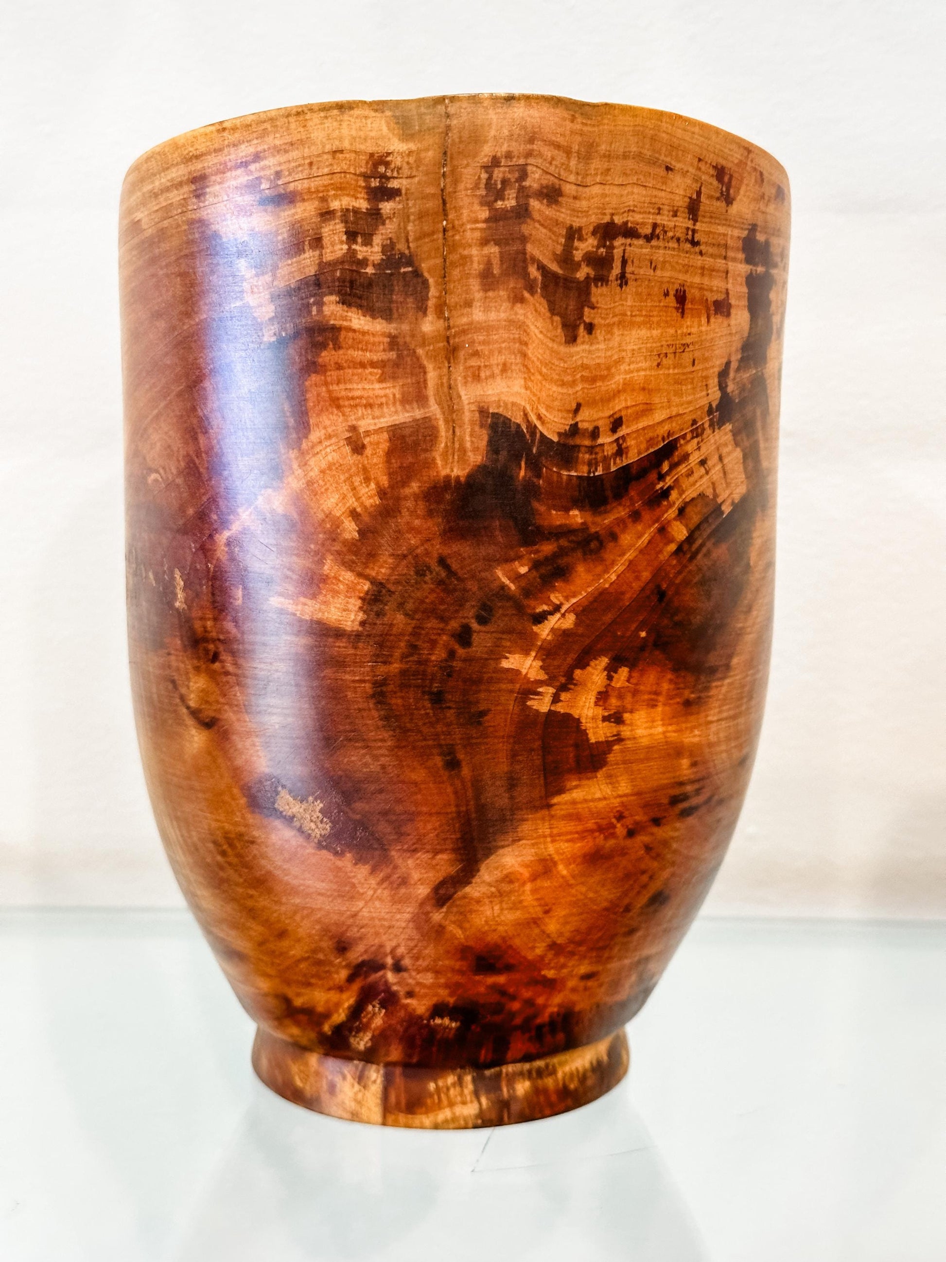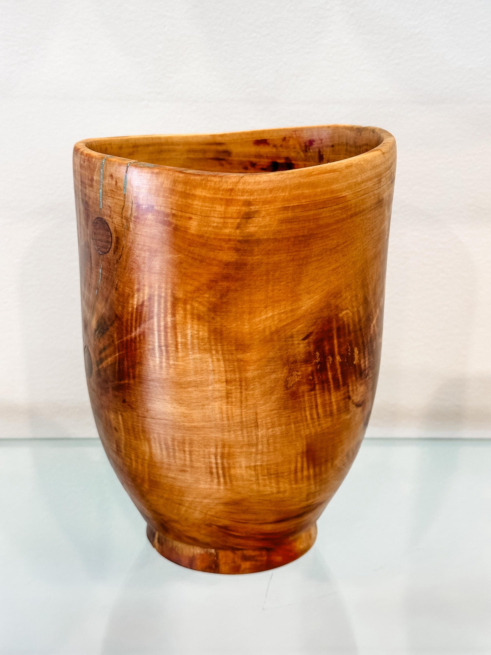 This beautiful orange wood bowl was hand-turned and hand-polished from an orange tree on the Big Island of Hawaii by professional bowl turner Llosh Winne. With real turquoise detailing and stunning lines and colors organically formed in the wood, this bowl is a true work of art, perfect for a wedding gift or home décor item. This vase-shaped bowl is repaired and beautified in Japanese kintsugi-inspired style. The artist fills holes and cracks in the wood with colorful turquoise gemstones. More than an art form, kintsugi is a metaphor for healing, reminding us that what is broken can be fixed. Instead of discarding something that breaks, we can repair it and the repair adds beauty and value, just like our challenges and traumas can strengthen us as humans. As a philosophy, Japanese kintsugi treats breakage and repair as an honorable and beautiful part of the history of an object that enhances, rather than diminishes, the value. Kintsugi teaches us that the “flaws” in wood art are what make each piece unique and valuable. We use the highest quality, organic finishing products, making our bowls food safe and chemical-free. Can be engraved. 5 inches diameter x 7 inches tall