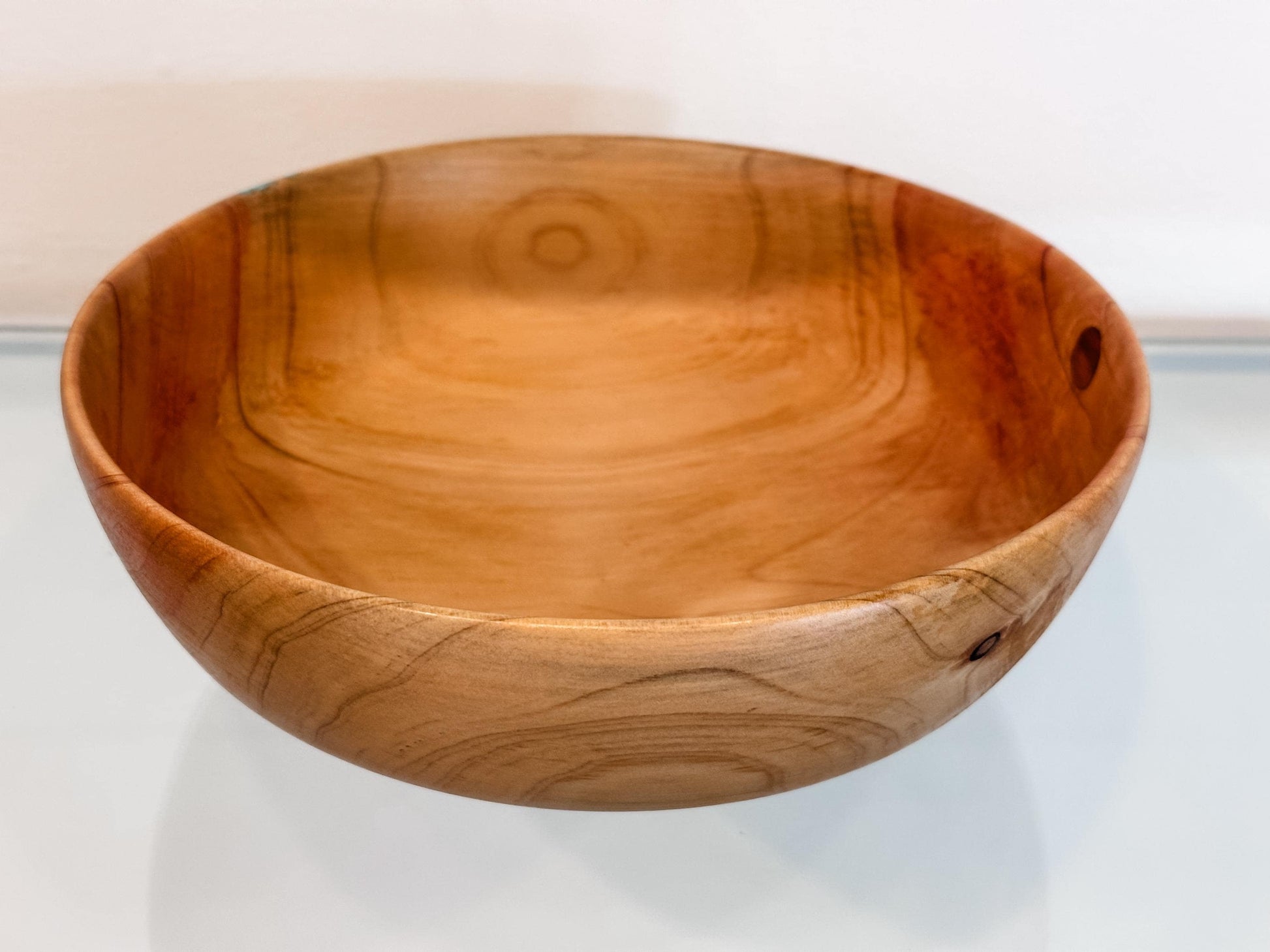 This traditional cypress wood salad bowl was handmade on the Island of Hawaii by professional artist and bowl turner Llosh Winne. Hand-carved from the log of a sustainably-sourced, locally-grown cypress tree, this bowl is made with great care and attention to detail. Made with fully-organic finishing products, this one-of-a-kind work of art is food safe and makes a perfect salad bowl, table centerpiece, wedding gift, fruit bowl, or home décor item certain to beautify any setting.