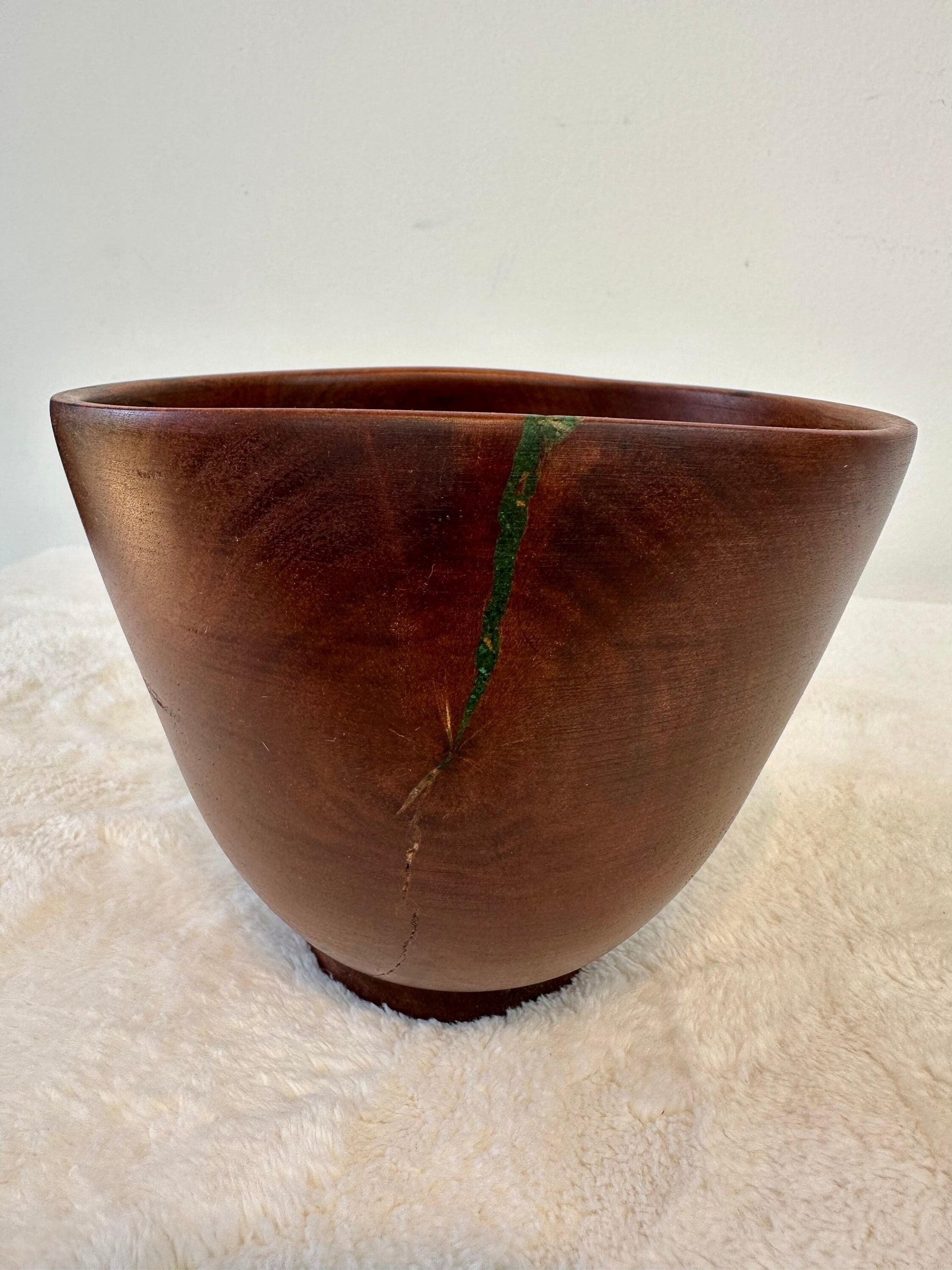 Avocado Wood Bowl, Handmade/Hand-turned in Hawaii by Wood Artist Llosh Winne, In traditional Japanese kintsugi style, the crack in this bowl is filled with turquoise gemstone inlay, making it a beautiful and unique work of art and Home décor item. Polished with beeswax, 6 inches wide x 5 inches tall