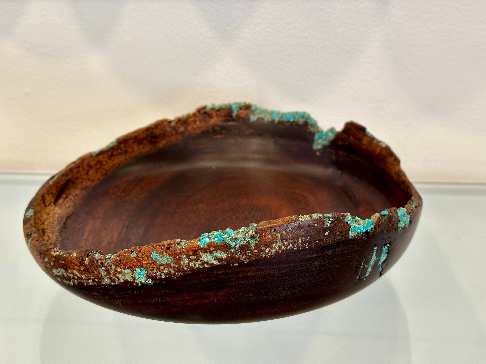 This stunning, natural edge, chocolate koa wood bowl was hand-turned on the Island of Hawai’i by professional artist and bowl turner Llosh Winne and is made out of revered Koa wood, a hardwood endemic to Hawaii and known as one of the most spectacular woods in the world. The natural edge bark inclusion on this bowl is incredibly unique. Enhanced in traditional Japanese kintsugi style, cracks in the bowl are strengthened and decorated with a significant amount of fine turquoise gemstone inlay. More than just an art form, kintsugi teaches us that the flaws in wood art are what make each piece original, beautiful and valuable. This bowl is truly a majestic piece, certain to beautify any home. Polished with organic linseed oil and beeswax, this bowl meets FDA food safe requirements. 10.5 inches diameter x 3.5 inches tall