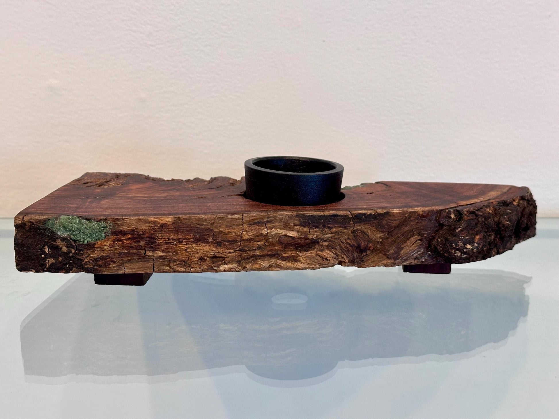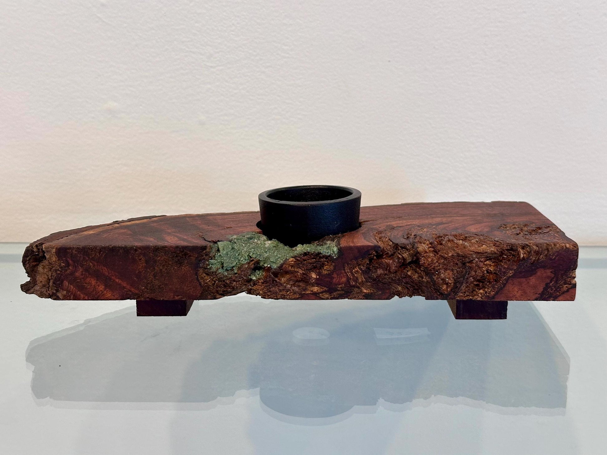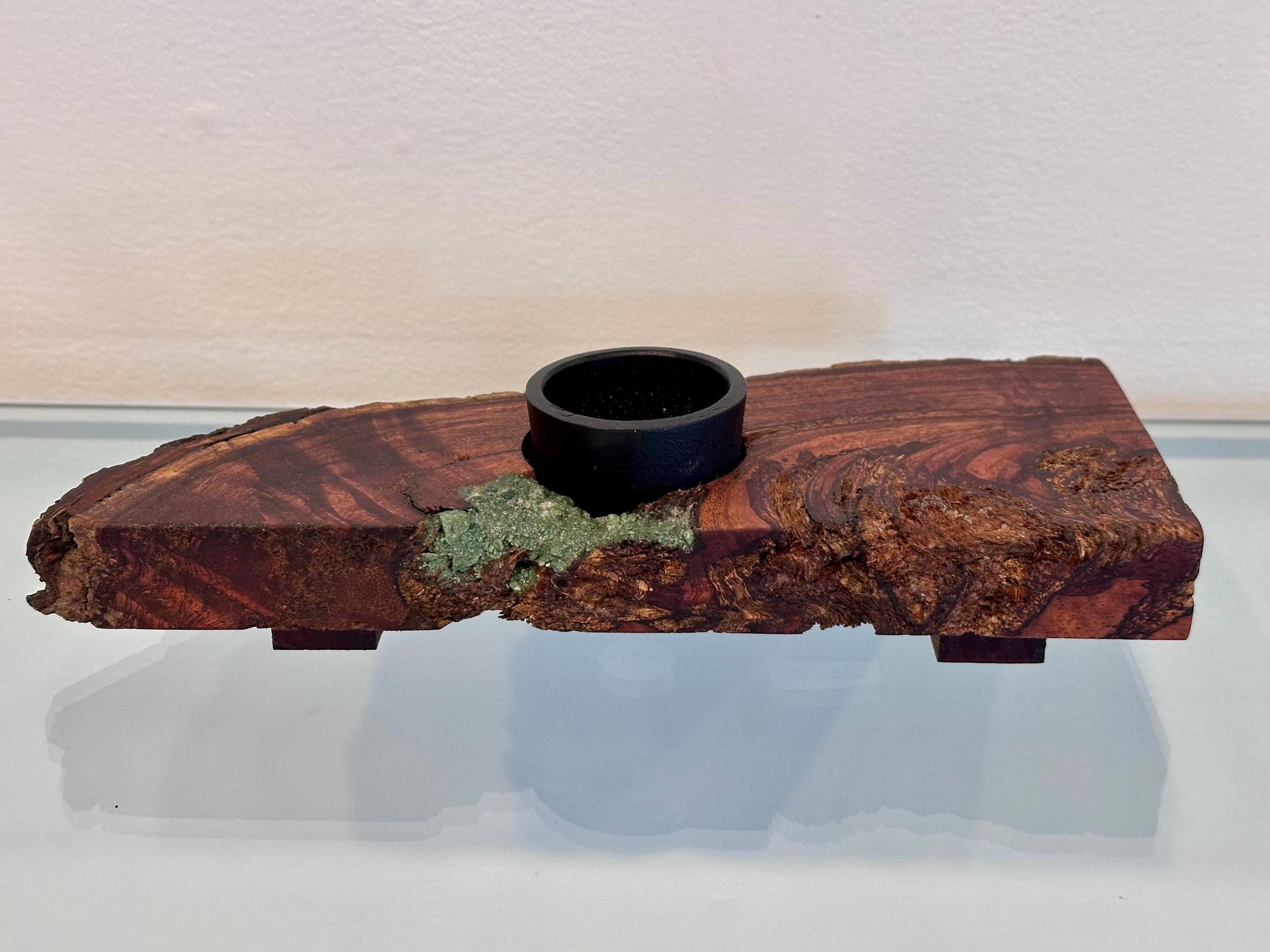 This stunning koa wood ikebana was handmade on the Island of Hawai’i from koa wood, sustainably-sourced from a local koa tree. The artist hand-carved the wood log to shape the ikebana, maintained the bark as a decorative inclusion, then added real blue-green turquoise gemstone inlay as a complementary contrast with the natural dark wood tones. This ikebana is special and unique for its raw, untouched beauty. The artist allows the natural wood itself to be the art.