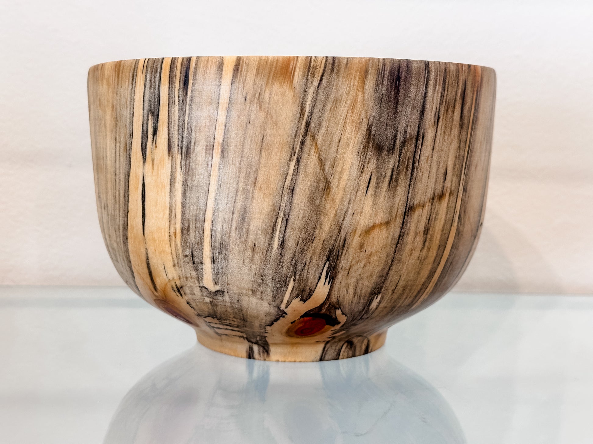 Norfolk pine trees grow in a ringed fashion, giving the wood a unique knot pattern. This bowl is very special because of the floral design the artist uncovers in the wood, in the center of the bowl. This bowl is also highly valued because of the fiery patterns the artist uncovered in the wood, as well as the thinness of the bowl, an extremely difficult task only achieved by the most highly skilled bowl turners who are able to turn the bowl thin enough, without breaking the bowl.