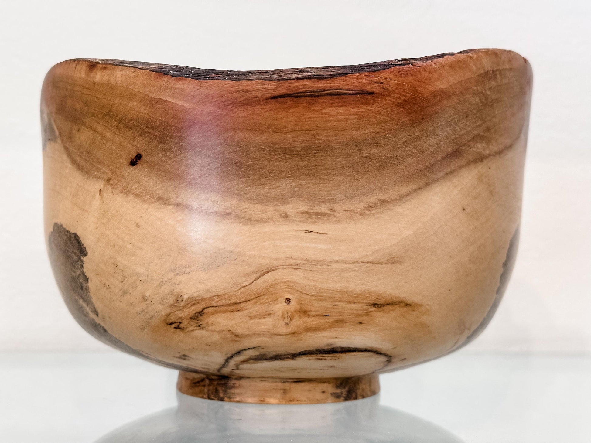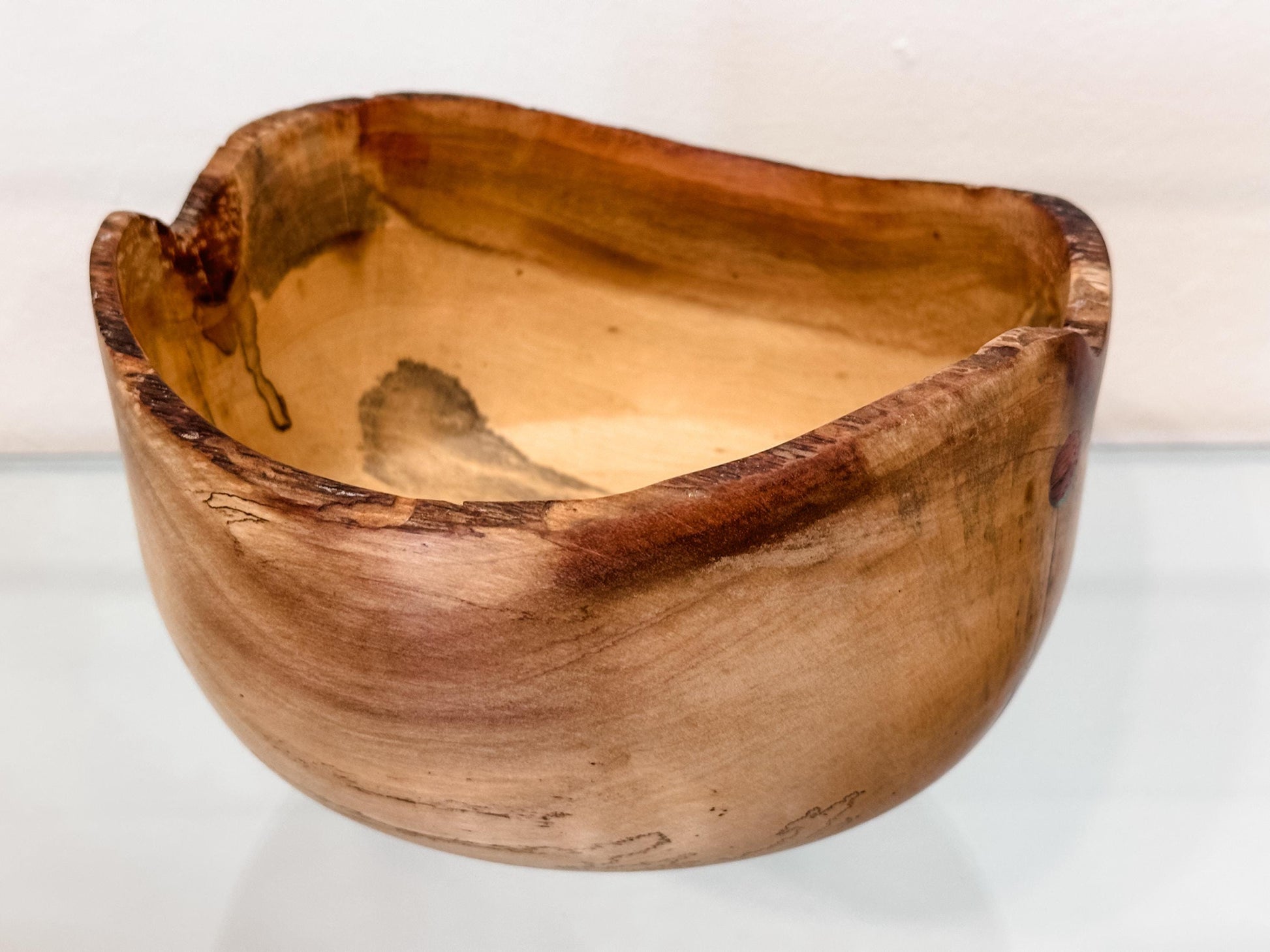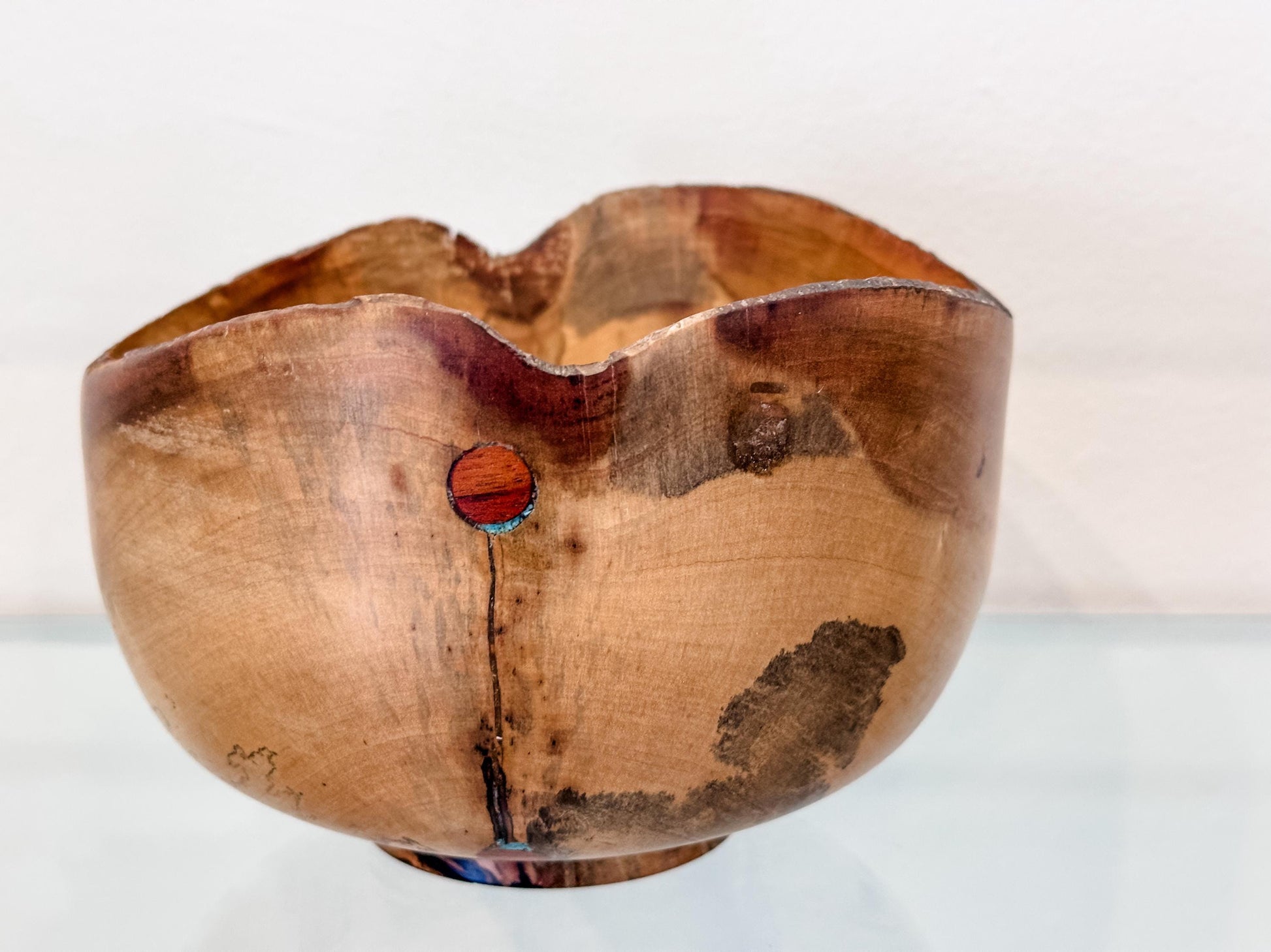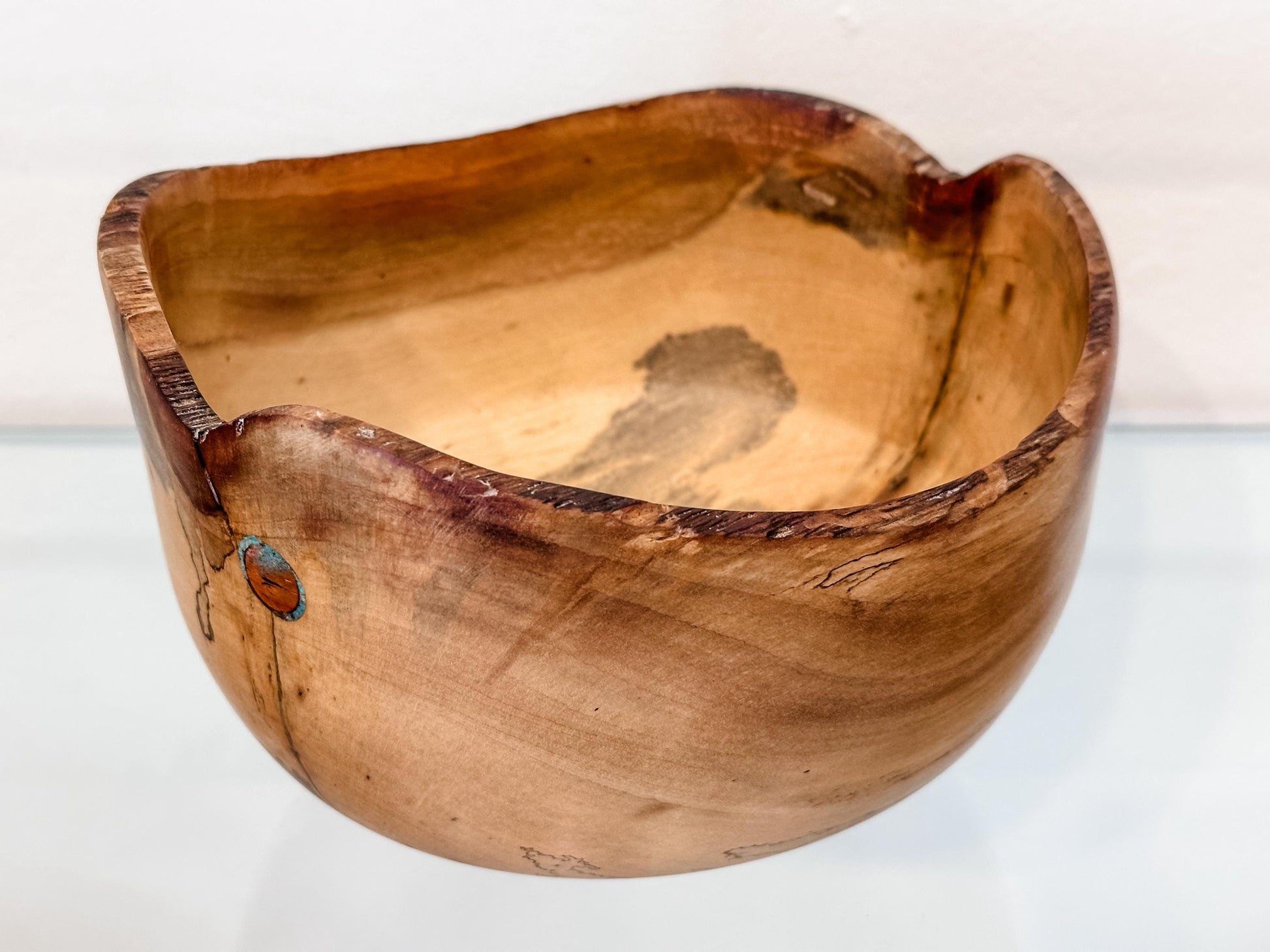 This lama wood bowl was handmade by professional artist and bowl turner Llosh Winne on the Big Island of Hawaii. Made directly from the wood of a locally-grown, sustainably-sourced lama tree, the artist hand-carved, turned and sanded the bowl with the utmost care and attention to detail, then added real turquoise gemstone inlay. The artist maintained a natural, live edge.