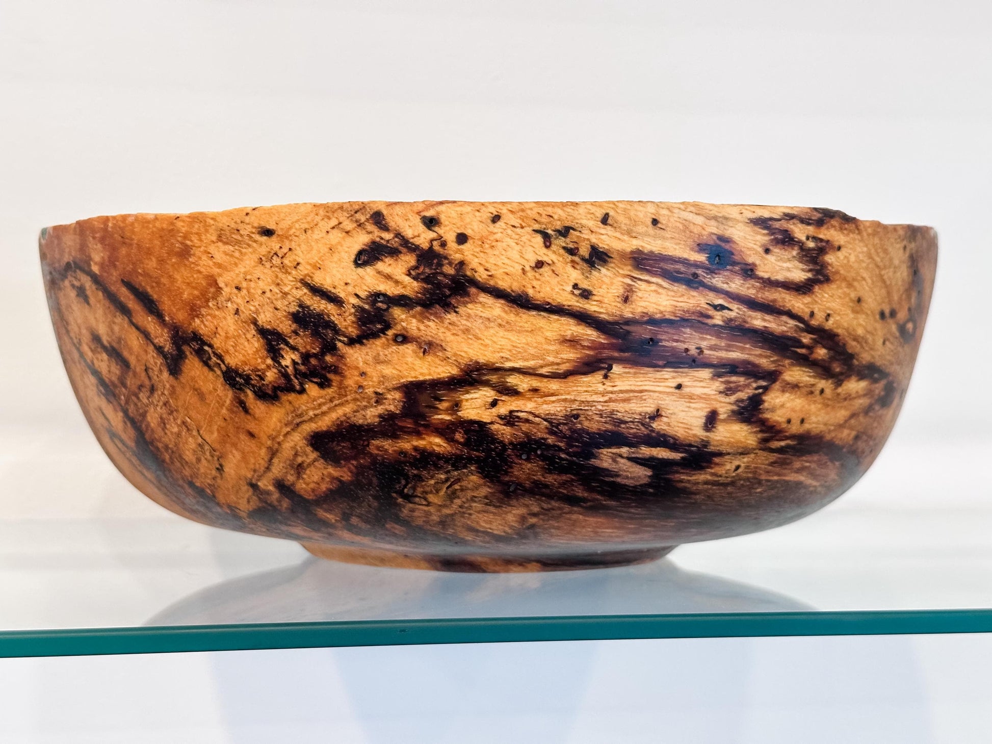 This beautiful wooden bowl was hand-turned out of tamarind wood and detailed with fine turquoise stone decorative inlay. Handmade in Hawaii with incredible attention to detail by professional artist and bowl-turner Llosh Winne, this wood bowl is perfect for home and kitchen décor as a table centerpiece or a statement piece. This artisanal bowl is exceptionally rare. The black spalting in the wood is created naturally by the decay of the tree over time. The artist allows the wood to sit in order for the unique spalted coloration to be produced, then the wood-worker has to have the insight to turn the wood into a bowl at just the right time to attain the mix of brown, tan and black colors. This is one of the artist’s favorite pieces in his collection.