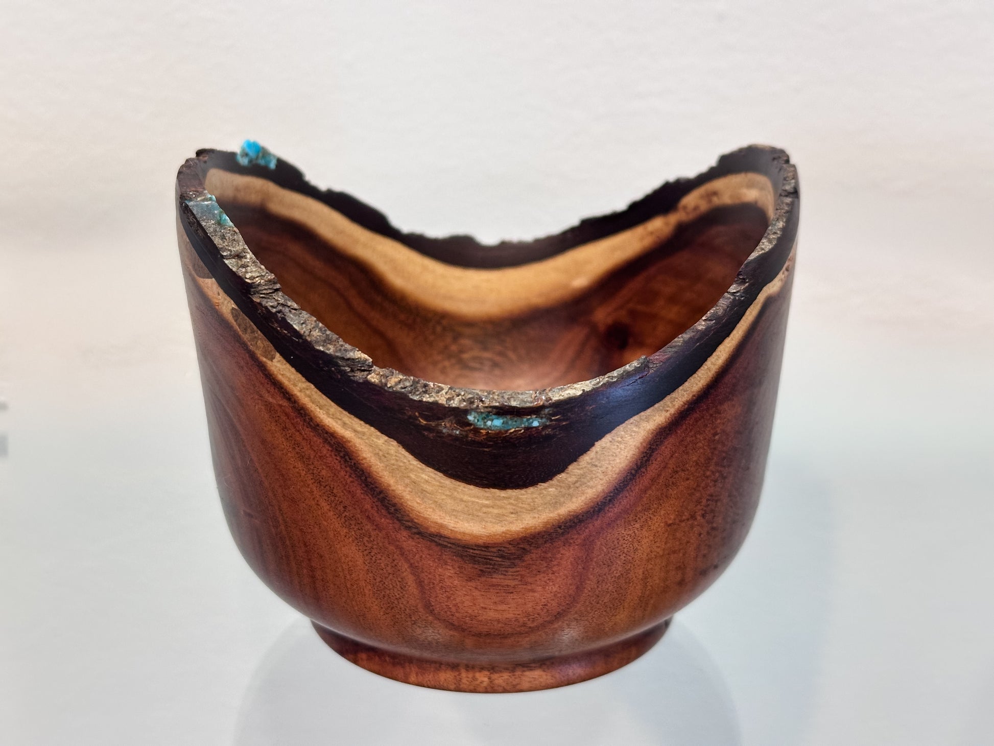 This artisanal bowl is craftfully detailed with real turquoise gemstone inlay. The artist maintained a natural edge with bark inclusion. Polished with organic linseed oil and beeswax, this bowl is food safe.